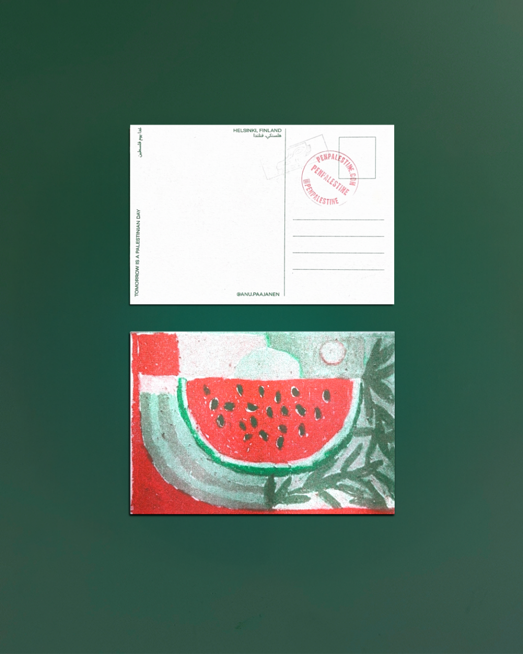 THE COST OF PRINTING THE POSTCARDS AND ADDITIONAL FEES IS INCLUDED IN THE SHIPPING, SO 100% OF THE SALE GOES TO MEDICAL AID FOR PALESTINIANS